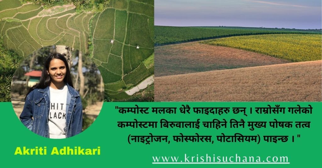 वर्षायाम लाग्दै छ। बिस्तारै बिस्तारै पानी परेसँगै बारीमा घाँस पलाउन थालेको छ । अब त यसो बारीतिर गयो, हरियाली देख्न पाइन्छ भन्ने हामी सोच्छौँ, तर यहि सँगै किसानले भन्दै होलान्् “बारीमा कति घाँस पलाएको, फेरी गाई वस्तुले नखाने घाँस पलाएछ, उखालेर फाल्नकै टन्टो ।” उता गाई वस्तु नपाल्ने र करेसा बरीमा केहि तरकारी लगाउने किसानहरु भन्दै होलान्, “यसो १, २ वटा बाख्रा अथवा भैसी पालेको भएपनि यी घाँसहरु दिन हुन्थ्यो, तरकारीलाई मात्र असर पारेको छ, उखालेर फालिदिनु पर्यो । यस्तै कुराहरु सोची हामी ती बारीबाट निस्किएका फोहोरहरुलाई त्यसै अव्यवस्थित रुपमा वारीको डिलमा, कान्लामा अथवा एक छेउमा फालिदिने गर्छौँ । त्यहि खेति गर्ने क्रममा भने हामी केहि किसानहरु बारीमा मलको अभाव भयो भन्दै यूरिया लिन बजार हिड्छौँ । यसो गरिरहँदा हामी आँफैले बिरुवालाई चाहिने खाद्य तत्व खेरा फालेका छौँ भन्ने कुरा भने विचार पुर्याउँदैनौँ । साँचै नै हामीले ती बारीमा निस्किएका फोहोरलाई सदुपयोग गर्न नसक्दा आँफैले उत्पादनलाई घटाइरहेका छौँ । त्यी बोट बिरुवा, घाँसपात, र पशुपालन गर्ने कृृषकहरुले गोबर र पिसाबलाई अव्यवस्थित रुपमा फाल्दा त्यसबाट बिरुवाले पाउन सक्ने खाद्य तत्व घटेर जान्छ । त्यसैले हामीले थोरै कुरामा ध्यान पुयार्यमा मात्र बिना खर्च बारीमानै मलको उत्पादन बढाई बिरुवालाई खाद्य तत्वको आवयश्कता पुर्याउन सक्छौँ ।