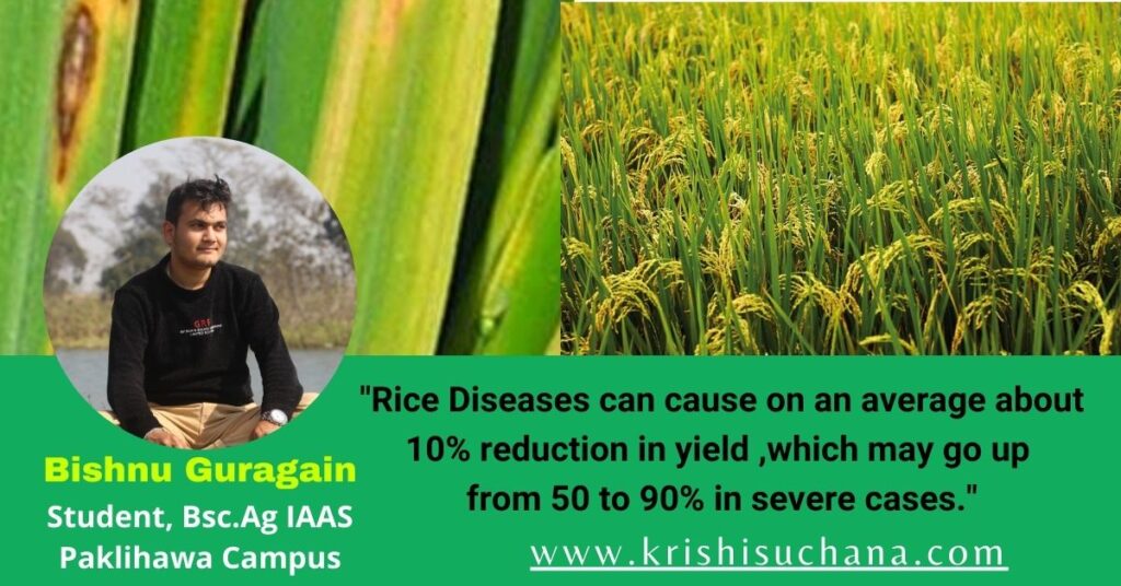 Diseases can cause on an average ,about 10 percent reduction in yield ,which may go up from 50 to 90 percent in severe cases. Planting the resistant variety is the simplest and often the most cost effective management of diseases. Some diseases occurring in rice are discussed here: