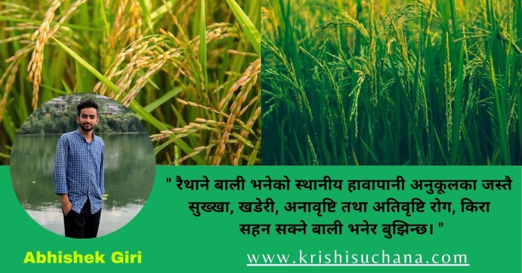 परिचय: रैथाने बाली भनेको स्थानीय हावापानी अनुकूलका जस्तै सुख्खा, खडेरी, अनावृष्टि तथा अतिवृष्टि रोग, किरा सहन सक्ने बाली भनेर बुझिन्छ। उक्त बाली सामाजिक तथा आर्थिक मूल्य बोकेका बालीहरू हुन, जुन मानव भोजन र पशुबस्तुको चारा तथा आहारा साथै औषधीजन्य प्रयोजनका लागि समेत प्रयोग गरिन्छ। यसका साथै, देशका विकट भेगमा खाद्य तथा पोषण सुरक्षाका लागि वरदान सावित छ र बाली विविधीकरणका (Diversification) लागि महतत्वपूर्ण मानिन्छन्।