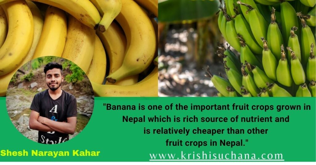Banana is one of the important fruit crops grown in Nepal which is rich source of nutrient and is relatively cheaper than other fruit crops in Nepal. It is cultivated in Terai, Inner-Terai, lower hills and besins region of Nepal. Banana plant is considered as fortune indicator in religious point of view and is used in Bartabandha, Wedding and other functions. It is also used as table fruit and vegetable crop in some areas nowadays. It is rich in vitamins, phosphorus, calcium like minerals and in comparison, to other fruit crops, So, this fruit which is easily cultivated using local resources at low cost it creates employment opportunity in the Terai region of Nepal.