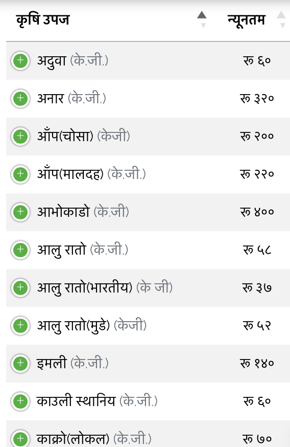 जसअनुसार अदुवाको प्रतिकेजी न्यूनतम मूल्य ६०,अनार मूल्य ३२०, आँप चोसा प्रतिकेजी २००,आँप(मालदह) २२०,डल्लेच्याउ ३५०,आलु रातो प्रतिकेजी मूल्य ५८,इमली १४० कायम भइ कारोबार भइरहेको छ ।