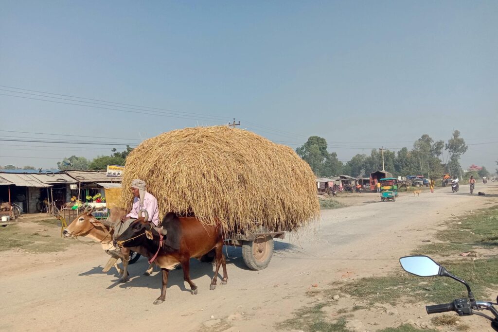 धानबाली भित्र्याएपछी त्यसको पराल बयलगाडामा राखेर लैजाँदै किसान। किसानहरूले पराल चौपायाको लागि व्यवस्थापन गरी वर्षभरि प्रयोग गर्ने गर्छन्।