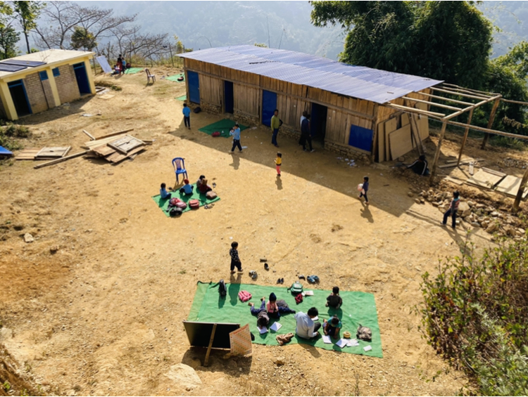 गलकोट:भिरालो जमिन खारेर बनाइएको चौरको छेउमा काठले बारेको तीन कोठ अस्थायी टहरा । टहराको एउटा कोठामा कार्यालय र अर्का दुई कोठामा पठनपाठन । अन्य तीन कक्षा खुला आकाशमुनि । विद्यालयको प्राङ्गणमा कार्पेटमाथि चलिरहेको पठनपाठनको दृश्य बागलुङको जैमिनी नगरपालिकाभित्रको हो ।