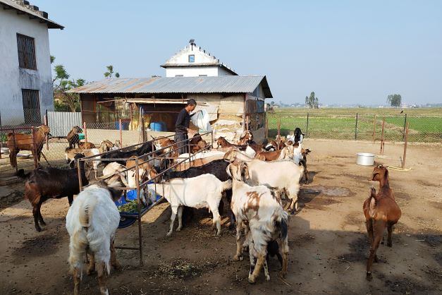 दस वर्ष विदेश बसाइँपछि स्वदेश फर्किर दाङको घोराही–६, अघराका रुप बुढाले व्यावसायिक रुपमा बाख्रा फार्म सञ्चालन गरी फार्ममा पाल्नुभएको बाख्रा । उहाँको फार्ममा अहिले ४६ वटा बाख्रा छन् ।