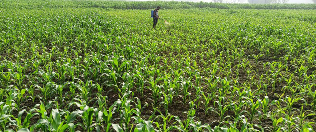 मकै बालीमा कीटनाशक औषधि छर्किदै किसान
