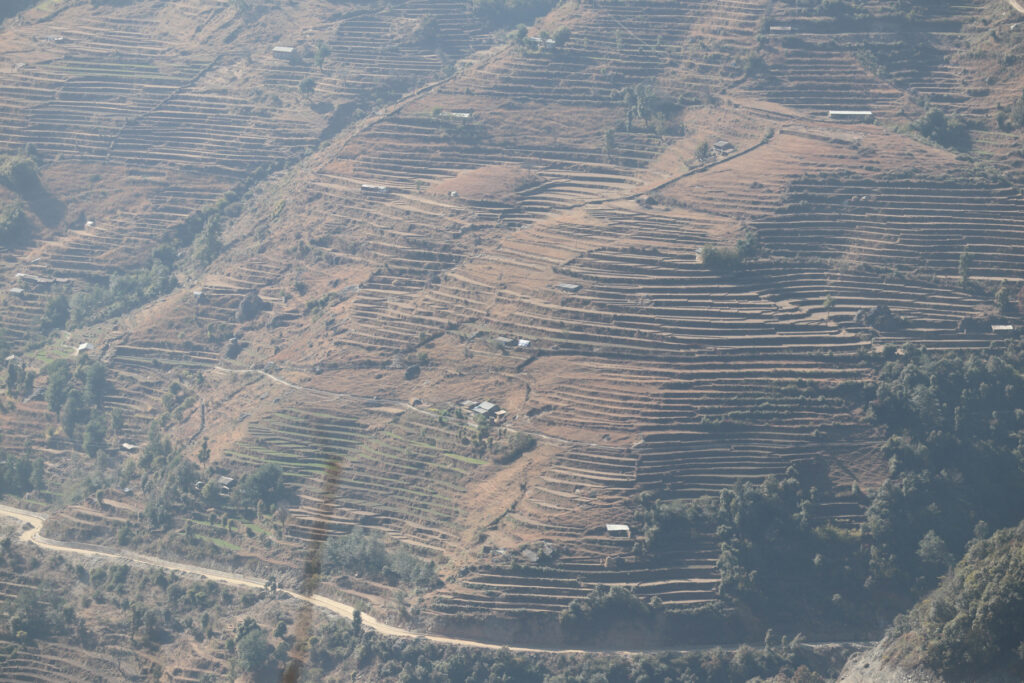 नुवाकोटको उच्च भेगीय क्षेत्र किस्पाङ गाँउपालिका–४ साल्मेमा सिँचाइ अभावले बाझै रहेको खेतबारी । अघिल्ला वर्ष माघ महिनामा नै मकै लगाइसक्ने यहाँका उर्बर खेतीबारी यो वर्ष हिउँदे वर्षा र हिँउ नपर्दा बाझै छ ।