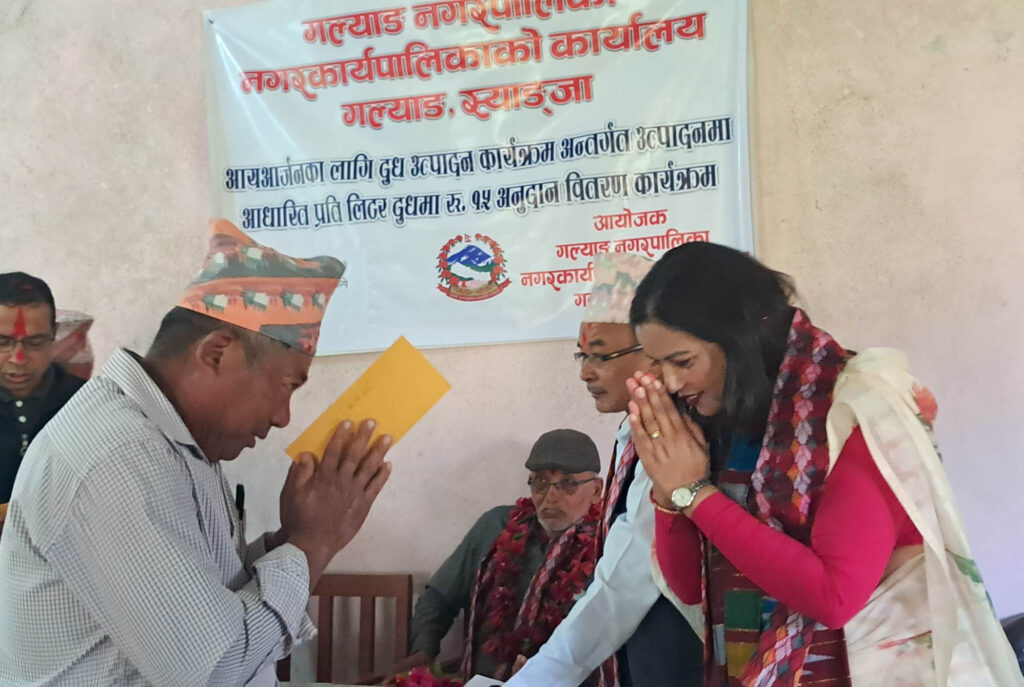 स्याङ्जाको गल्याङ( ८, झोल्पेमा रहेको गाउँ सुधार दुग्ध उत्पादक सहकारीमा दूध सङ्कलन गर्ने किसानलाई अनुदान रकम प्रदान गर्नुहुँदै गल्याङ नगर उपप्रमुख हेमा न्यौपाने । नगरपालिकाले आयआर्जनका लागि दूध उत्पादन गर्दै आएका किसानलाई प्रतिलिटर रु १५ अनुदान उपलब्ध गराउँदै आएको छ ।