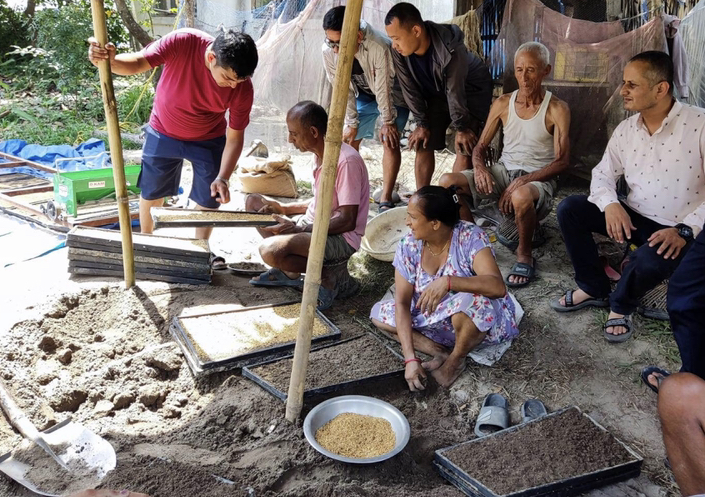 ‘ट्रे’मा धानको बीउ राख्दै किसान