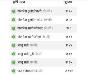 लोकल बन्दा प्रतिकेजी रू १०,गोलभेडा सानो ८,मूला १५,तितो करेला ३०,घिरौला ४०,बरेला ९०