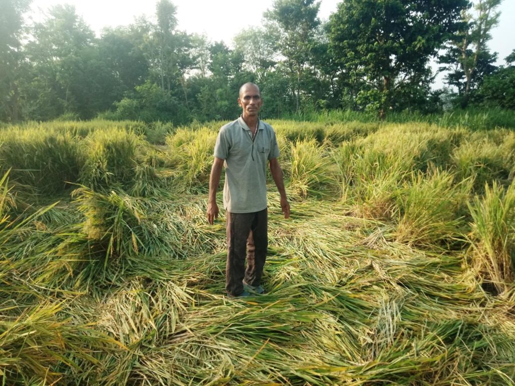 शुक्लाफाँट नगरपालिका ७ सिमलफाँटामा गएराती हात्तीको बथानले धानबालीमा गरेको क्षतिबारे जानकारी दिँदै किसान ।