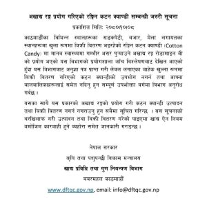 कृषि तथा पशुपन्छी विकास मन्त्रालय अन्तर्गतको खाद्य प्रविधि तथा गुण नियन्त्रण विभागले एक सुचना सार्वजनिक गर्दै खुल्ला रुपमा बिक्री वितरण भइरहेको रंगिन कटन क्याण्डीमा मानव स्वास्थ्यमा गम्भीर असर पुर्याउने अखाद्य रंग ‘रोडामाइन बी’ प्रयोग भएको पाइएकाले यसलाई नखान आग्रह गरेको हो ।