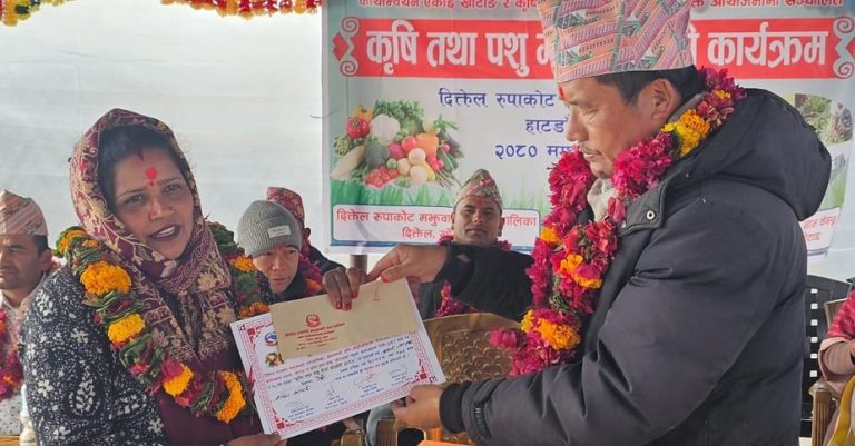 खोटाङ:कृषि तथा पशु मेला प्रदर्शनीमा सहभागी ४३ किसानलाई पुरस्कृत तथा २९ किसानलाई सम्मान गरिएको छ । दिक्तेल रुपाकोट मझुवागढी नगरपालिका, प्रधानमन्त्री कृषि आधुनिकीकरण परियोजना र कृषि ज्ञान केन्द्र खोटाङले संयुक्तरूपमा आयोजना गरेको कृषि तथा पशु मेला प्रदर्शनी कार्यक्रममा सहभागी किसानलाई पुरस्कार तथा सम्मान प्रदान गरिएको हो ।