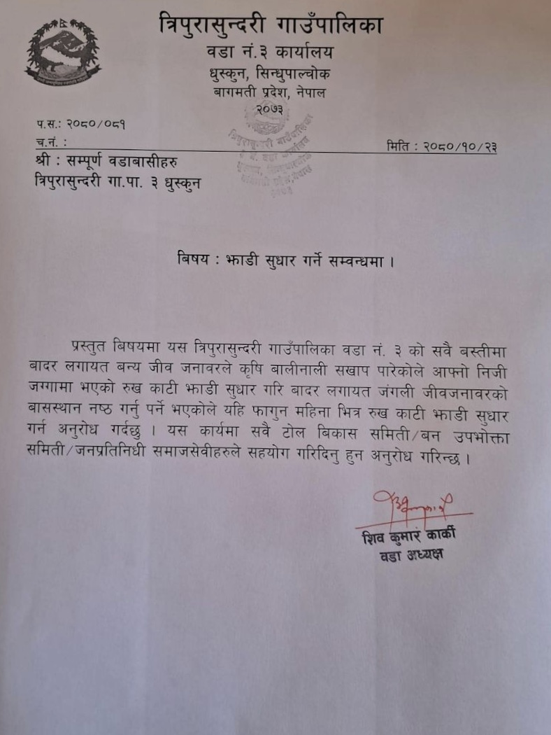 सिन्धुपाल्चोक: सिन्धुपाल्चोकको त्रिपुरा सुन्दरी गाउँपालिकाको वडा नम्बर ३ को सबै बस्तिमा बाँदर लगायत अन्य जिव जनावरले कृषि बालिनाली सखाप पारेको भन्दै वडा अध्यक्ष शिव कुमार कार्कीले एक सूचना निकाल्दै फागुन भित्र आफ्नो निजी जग्गामा भएको रुख काटी झाडी सुधार गर्न आग्रह गरेका छन्।
