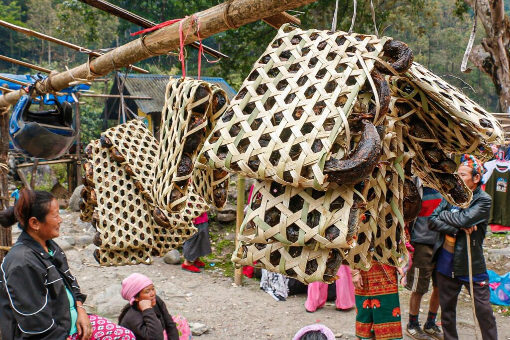 सङ्खुवासभाको सिलिचोङ गाउँपालिका–२ बुधबारे बजारमा लाग्ने साप्ताहिक हाटमा बिक्री गर्न पेरेङ्गोमा राखिएको संखुवा खोलाको असला माछा ।