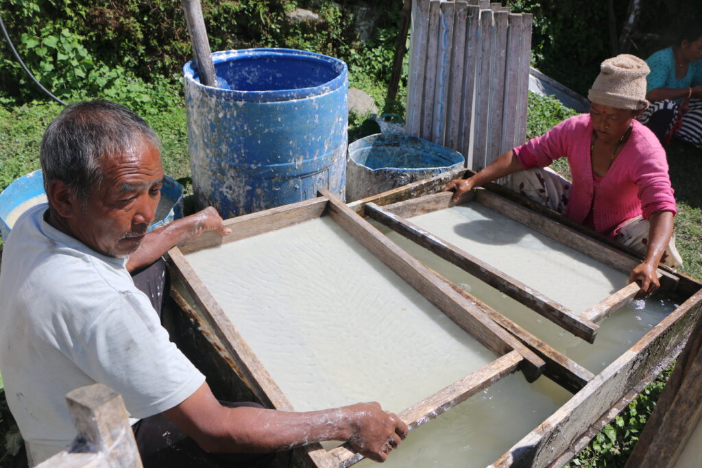 “जाडो मौसममा सुक्न अलिक समय लाग्ने भएकाले गर्मी मौसममा भन्दा कम उत्पादन हुन्छ”, शेर्पाले भन्नुभयो, “गर्मी मौसममा बढीमा तीन घण्टाभित्र जालीमा राखेको लेदो सुकेर कागज तयार हुन्छ तर जाडामा सुक्न पाँच घण्टा लाग्छ ।”