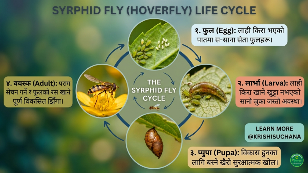 फुल (Egg): वयस्क पोथीले लाही किरा (Aphids) भएका पातहरूमा स-साना सेता फुलहरू पार्छ।